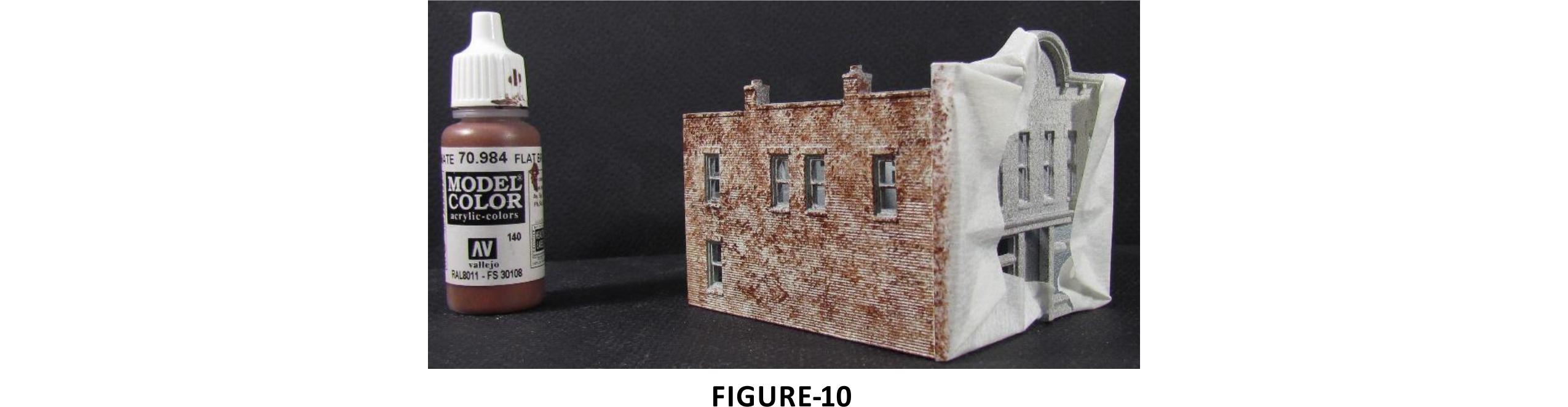After masking off the front wall, I started dabbing spots of the darkest brick color that I’ll be using first. For this build, the first color is Vallejo “Flat Brown,” number 70.984 from the “Model Color” collection, as seen in FIGURE-10. Since this is the base color; I apply it first with dabbing of the brush lightly onto the surface of the model, followed by a little dry brushing. This first layer leaves a lot of the “mortar” color still showing on the tops of the bricks. Don’t try to completely cover all of the bricks in any one step.